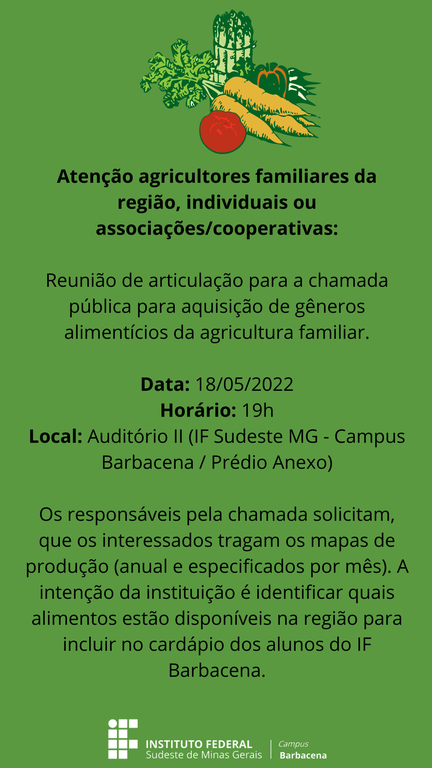 A reunião ocorrerá no dia 18 de maio de 2022, às 19h, no Auditório II do IF Sudeste MG – Campus Barbacena (Prédio Anexo). Todos os produtores rurais estão convidados.