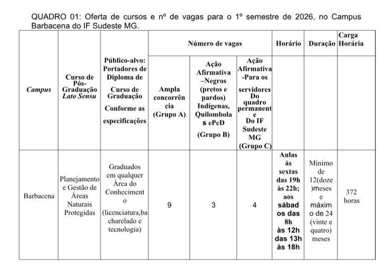 Campus Barbacena divulga edital de vagas ociosas para o Curso de Pós-graduação Lato Sensu em Planejamento e Gestão de Áreas Naturais Protegidas