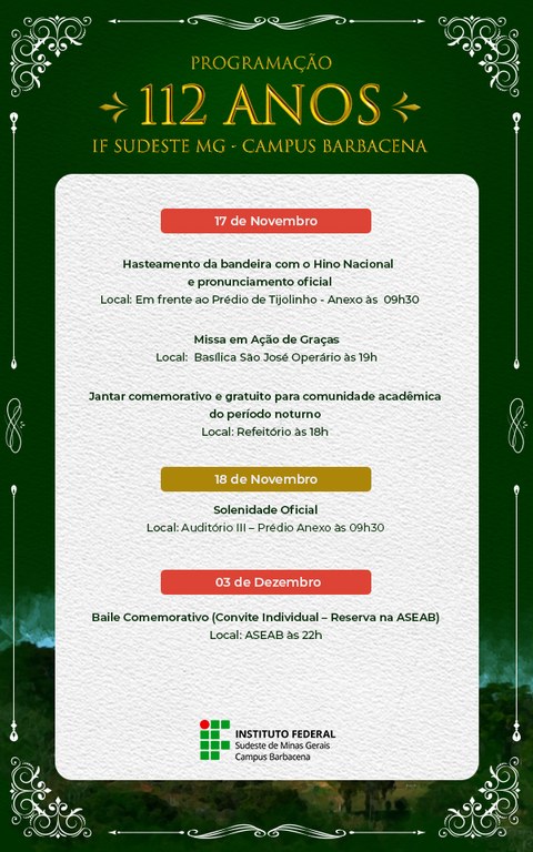 Campus Barbacena divulga programação comemorativa aos 112 anos