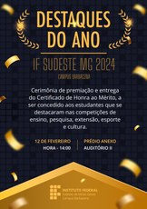 Na próxima quarta-feira, dia 12 de fevereiro de 2025, às 14h, no Auditório 2, a Diretora-geral do Campus Barbacena realiza a cerimônia de premiação e entrega do certificado de honra ao mérito, para os estudantes que se destacaram nas competições de ensino, pesquisa, extensão, cultura e esportiva.