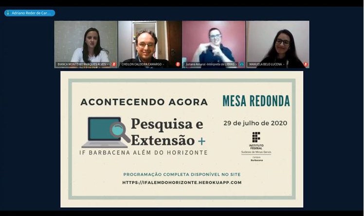 Na última semana, entre os dias 29 e 31 de julho o Campus Barbacena realizou seu primeiro evento totalmente online: "Pesquisa e Extensão: IF Barbacena além do horizonte". O evento contou com uma mesa-redonda com o tema "IF além do horizonte: Diálogo sobre permanência e êxito do egresso" e oito sessões de apresentações de trabalhos de pesquisa e extensão. Foram 64 trabalhos apresentados, 47 avaliadores nas apresentações e cerca de 65 ouvintes por sessão.