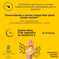 A Diretoria de Ensino realiza na próxima quarta-feira, dia 11 de setembro, às 09h, no Auditório 2, uma palestra sobre saúde mental.