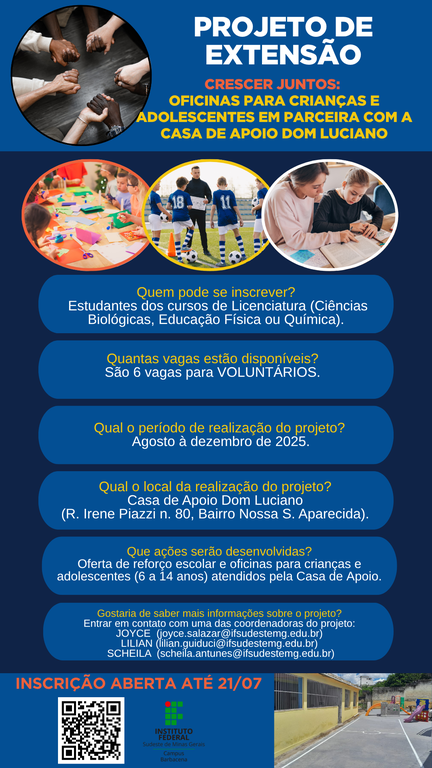 Estão abertas as incrições para a seleção de voluntário para participar do Projeto "Crescer juntos: oficinas para crianças e adolescentes em parceria com a Casa de Apoio Dom Luciano"