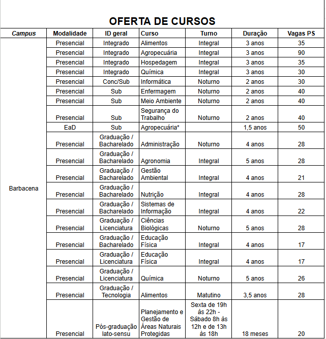 No Campus Barbacena , são mais de 600 vagas. Em 2026, serão ofertados 2 cursos novos: Bacharelado em Sistemas de Informação (4 anos - Integral) e Bacharelado em Educação Física (4 anos - integral). Veja o quadro de vagas: