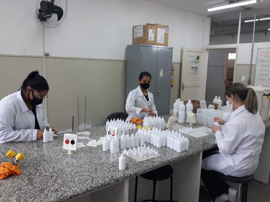 #Pratodosverem: três mulheres de jalecos brancos, e máscaras, fazendo álcool glicerinado 70%, na bancada de um laboratório.