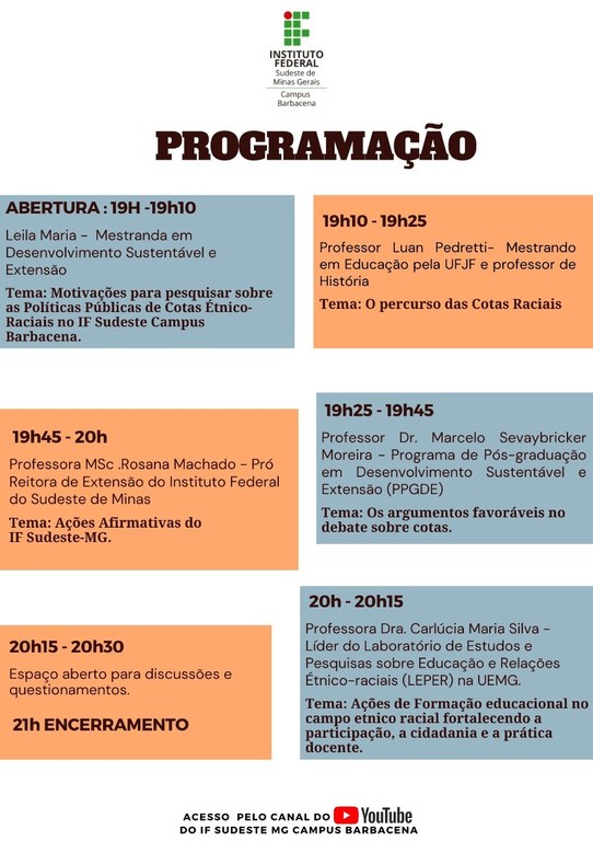 O evento é voltado para a comunidade acadêmica e será transmitido pelo canal do Campus Barbacena no Youtube.