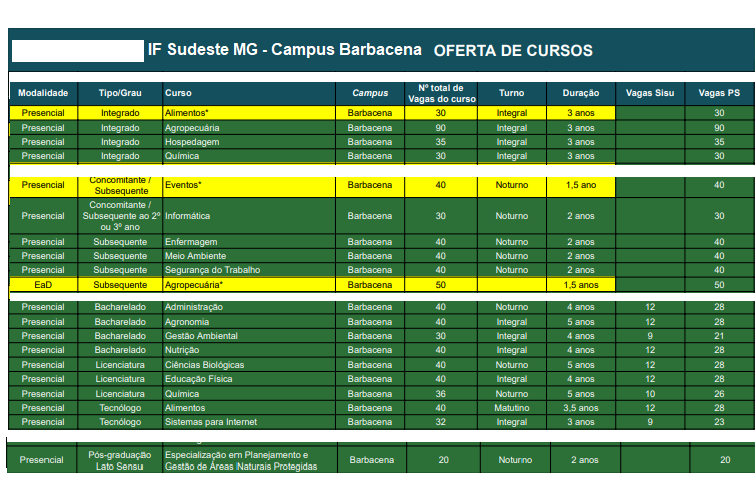 Nesse Processo Seletivo, há 03 novos cursos: curso técnico em alimentos integrado ao ensino médio, curso técnico em eventos concomitante/subsequente ao ensino médio e curso técnico em agropecuária na modalidade EaD.
