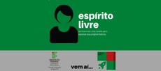 A ilustração, com fundo predominantemente verde, mostra o contorno do busto de uma pessoa sem rosto definido, ao lado da expressão "espírito livre", em destaque, seguida da frase: "ser livre é possuir uma caneta para escrever sua própria história". Na parte inferior da imagem, sobre o fundo cinza, estão dispostas lado a lado a logomarca do IF Sudeste MG - Campus Cataguases, a expressão "vem aí" e a logomarca do curso de Intraempreendedorismo.