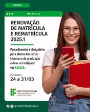 O procedimento é obrigatório para estudantes dos cursos técnicos e de graduação do Campus Manhuaçu e é necessário para que os estudantes possam cursar as disciplinas a serem ofertadas de abril a agosto de 2025. A renovação de matrícula é realizada on-line, no Sistema Acadêmico SIGAA, disponível na opção "Sistemas" na aba “Estudante” do site do IF Sudeste MG ou pelo endereço sig.ifsudestemg.edu.br/sigaa.