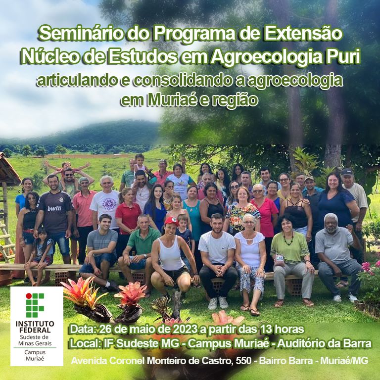 O Núcleo de Estudos em Agroecologia Puri (NEAP) do IF Sudeste MG – Campus Muriaé convida para o Seminário do Programa de Extensão “Articulando e consolidando a Agroecologia em Muriaé e região”, que será realizado na sexta-feira, dia 26, a partir das 13h no auditório da unidade Barra.
