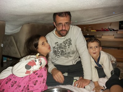 O Professor do Campus Santos Dumont Fernando Paulo Caneschi, e sua esposa Nívea Maria Valente, são pais de Maria Fernanda, 8, e de Pedro Antônio, 4 anos. Em home office, Fernando aproveita para ficar mais perto dos filhos e brincar bastante com eles: “Ser pai nessa época de pandemia e isolamento social está sendo uma experiência nova. Adoro ficar com meus filhos por perto. Sempre que posso, estou com eles durante os encontros online da escola. Estou trabalhando em home office. Durante a manhã geralmente eles ficam brincando, à tarde minha filha participa da aula online, e meu filho fica comigo fazendo trabalhinhos. E à noite assistimos à TV juntos. Apesar de eles terem uma rotina, sempre querem me "testar" e pedem celular, tablet ou TV. Então, a maior dificuldade é mantê-los longe dos eletrônicos”. Na tentativa de vencer esta dificuldade, Fernando usa a criatividade para entreter as crianças. Na imagem abaixo ele e os pequenos se divertem em uma cabaninha: