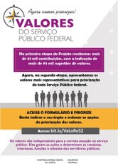 A segunda etapa da campanha sobre Valores do Serviço Público Federal, promovida pela Controladoria-Geral da União (CGU), está aberta. Nesta etapa, que se inicia hoje e vai até o dia 31 de novembro, os membros da comunidade acadêmica e colaboradores da instituição deverão realizar a priorização dos 10 valores pré-selecionados na primeira etapa da campanha (conheça o resultado da primeira etapa).