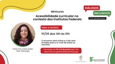 As inscrições para a segunda edição do Ciclo de Minicursos "Diálogos Inclusivos", promovido pela Coordenação de Ações Inclusivas do IF Sudeste MG, estão abertas e seguem até 14 de junho. O evento acontece no dia 15 do mesmo mês, de 14 às 16 horas, e tem a "Acessibilidade curricular no contexto dos Institutos Federais" como tema. A palestrante será a pedagoga Carla Ariela Rios Viralonga.