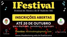 Estão abertas as inscrições para o 1° Festival de Música do IF Sudeste MG – IFestival 2023. O Festival prevê a submissão de composições inéditas (próprias) de Música Popular Brasileira por estudantes, egressos, servidores e colaboradores terceirizados do Instituto Federal do Sudeste de Minas Gerais.