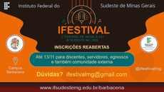 Estão reabertas as inscrições para o 1° Festival de Música do IF Sudeste MG – IFestival 2023. O  Festival prevê a submissão de composições inéditas (próprias) de Música Popular Brasileira por estudantes, egressos, servidores e colaboradores terceirizados do Instituto Federal do Sudeste de Minas Gerais. Além disso, nessa nova etapa de inscrição, a comunidade externa também pode participar.
