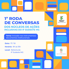 No próximo dia 17, terça-feira, a Coordenação de Ações Inclusivas (CAI) vai promover a "1ª Roda de Conversas dos Núcleos de Ações Inclusivas do IF Sudeste MG". O encontro será na Reitoria, de 9 às 15 horas, com o o tema "Inclusão nos instrumentos/documentos institucionais". Coordenadores dos NAIs e demais servidores dos NAIs/CAI de todas as unidades estão convidados.