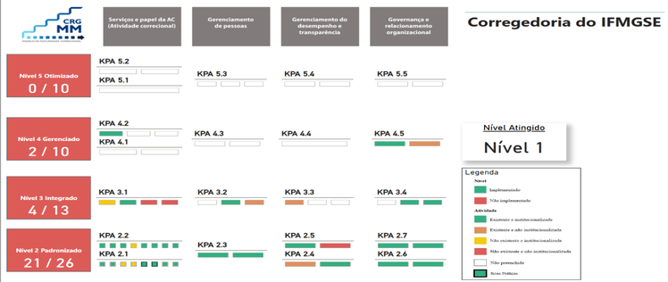 Cada nível abrange quatro áreas de avaliação com critérios e características específicos. De acordo com o corregedor, os resultados alcançados servirão de referência para o diálogo com a alta administração do Instituto, com vistas a melhorias estruturais e ao aperfeiçoamento contínuo dos processos/procedimentos institucionais.