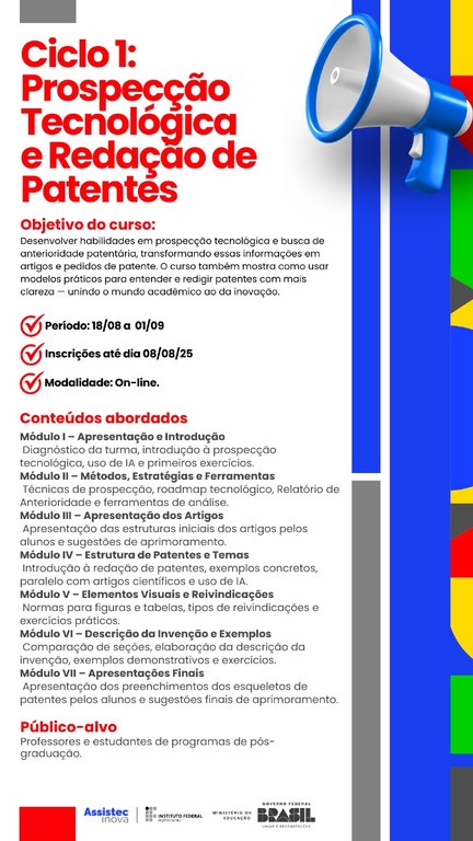 O objetivo do curso é ensinar, na prática, como fazer busca de anterioridade patentária, escrever artigos de prospecção tecnológica e entender a estrutura das patentes