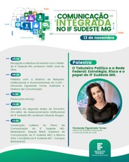9h20: Palestra “O Tabuleiro Político e a Rede Federal: Estratégia, Risco e o papel do IF Sudeste MG”, com a diretora de Relações Institucionais e Governamentais do Conselho Nacional das Instituições da Rede Federal de Educação Profissional e Tecnológica (Conif) - Fernanda Figueiredo Torres, o reitor do IF Sudeste MG e a diretora de Comunicação da instituição, Raquel Blank