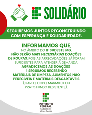 Informamos que, no âmbito do IF Sudeste MG, não serão mais necessárias doações de roupas. Materiais de limpeza, alimentos não perecíveis e materiais descartáveis são bem-vindos