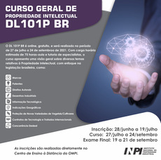 Estão abertas, até o dia 19, as inscrições para a terceira edição de 2021 do CURSO GERAL DE PROPRIEDADE INTELECTUAL À DISTÂNCIA - DL 101P BR -, oferecido pelo INPI, Instituto Nacional de Propriedade Industrial, em parceria com a OMPI (Organização Mundial de Propriedade Intelectual), conforme imagem abaixo.