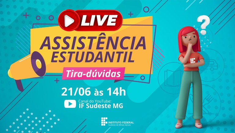 Na próxima segunda, 21, o IF Sudeste MG vai promover uma live para tirar dúvidas dos estudantes sobre os editais de Assistência Estudantil.