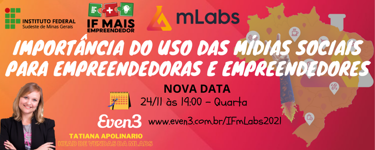 A palestra, que estava marcada para 28 de outubro, tem uma nova data: 24 de novembro, às 19 horas. A "Importância do uso das mídias sociais para empreendedoras e empreendedores e como proceder para bem gerenciar as mídias sociais" será tema do evento, que conta com apoio do IF Sudeste MG. Haverá um momento teórico e um momento prático em que as e os participantes conhecerão uma ferramenta web para gestão de mídias sociais, a mLabs, parceira do evento.