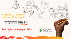 #Pratodosverem: Imagem de divulgação do edital: com fundo branco e desenhos feitos a grafite e relacionados ao café. No canto inferior direito, uma mão negra segura um lápis amarelo, finalizando os desenhos. No canto esquerdo, há a expressão "Programa 'O Brasil é o café e o café é o negro'", em amarelo, seguida pela expressão: "Confira o edital para ações especificadas dos NEABIS", em preto, e, por fim, "Inscrições de 10/0 a 08/04", em vermelho.