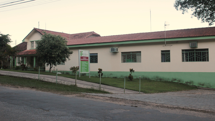Imagem do Prédio Administrativo. Ele é pintado nos tons de bege e verde. Quatro janelas de sua lateral estão aparentes. À frente, um jardim com uma placa indicativa dos setores. Em primeiro plano, a calçada.