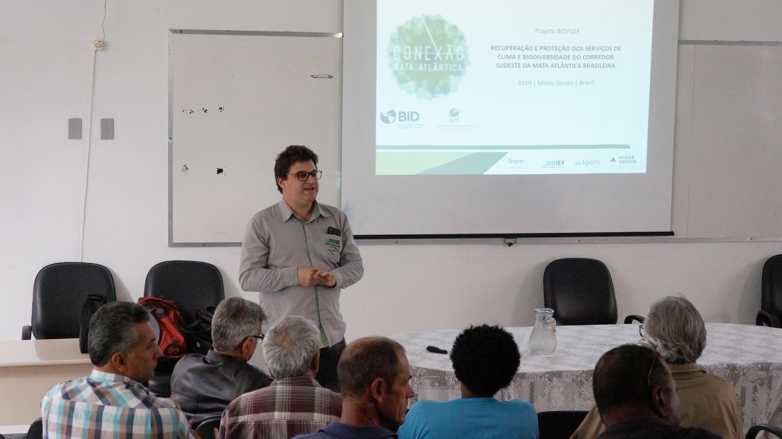 O palestrante aparece em pé, usando uma camisa cinza com o símbolo do IEF no bolso. De frente para ele, aparece alguns membros da plateia. Ao fundo, a imagem projetada da apresentação com o título "Recuperação e proteção dos serviços do clima e biodiversidade do corredor sudeste da Mata Atlântica brasileira".