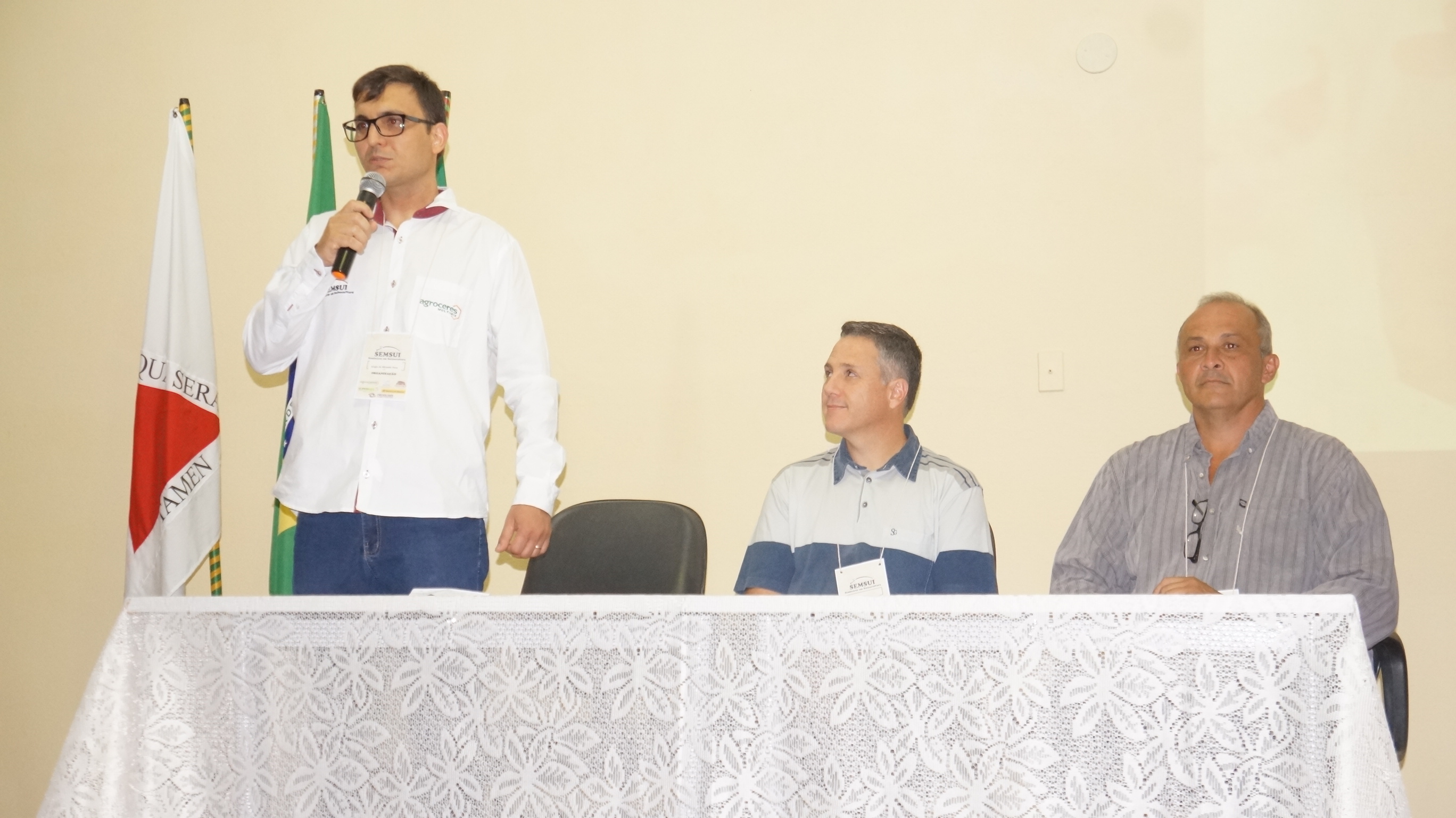 #Pratodosverem: Mesa de abertura do evento. À esquerda, em pé, o coordenador do evento Sérgio Pena está com microfone na mão. O diretor de Pesquisa Rafael Monteiro e o chefe do Departamento Edilson Capelli estão sentados ao lado. À frente mesa com toalha branca de renda. Ao fundo, bandeira de Minas Gerais.