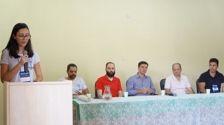 #Pratodosverem: À esquerda, Luana aparece de pé em um púlpito com microfone na mão. Ela está com a camisa do evento. À direita, há a mesa de abertura do evento com cinco pessoas sentadas. A mesa tem toalha branca. Em cima há jarra de água e copos descartáveis.