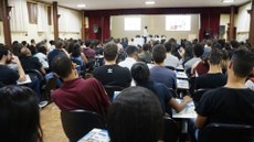 #Pratodosverem: Plateia do Salão Nobre lotada. Na imagem, as pessoas aparecem de costas, estando de frente para o palestrante.
