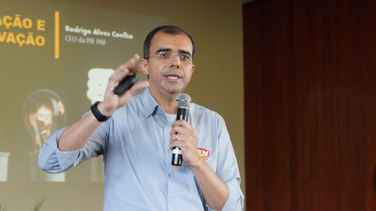 #Pratodosverem: Presidente da Pif Paf, Rodrigo Coelho, está segurando microfone na mão esquerda e passador de slide na direita. Ao fundo, há imagem da projeção da palestra.