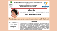 A convidada, professora titular da UFMG, dra. Samira Zaidan, falará sobre o tema "Elaboração de recursos educacionais no Mestrado Profissional ", tema de grande importância para os estudantes para a integralização do curso.