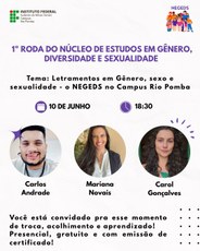 O Núcleo de Estudos em Gênero, Diversidade e Sexualidade (NEGEDS) realiza na próxima terça-feira, 10/06, para a primeira roda de conversa sobre "Letramentos em gênero, sexo e sexualidade - o NEGEDS no campus Rio Pomba". O evento acontece a partir das 18h30, no Anfiteatro do Prédio Central.