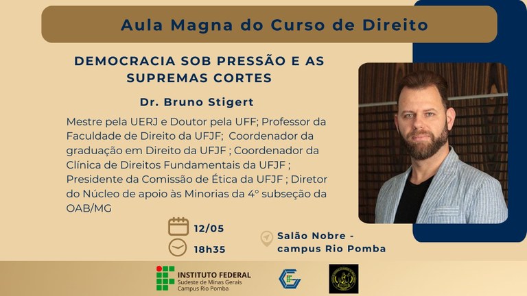 Docentes, estudantes e público em geral estão convidados para a palestra do Dr. Bruno Stigert, que acontece no dia 12/05, às 18h35, no Salão Nobre do campus Rio Pomba