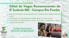 O Campus Rio Pomba do IF Sudeste MG abriu edital de seleção para vagas remanescentes dos cursos de graduação, com ingresso no 2º semestre letivo de 2022. Hoje, 13 de junho é o último dia para os interessados em candidatar-se a uma das 115 vagas oferecidas pelo campus. Devem encaminhar e-mail com os documentos listados no edital para a Coordenação Geral de Graduação: vagasremanescentes.riopomba@ifsudestemg.edu.br, com o assunto: INSCRIÇÃO VAGAS REMANESCENTES