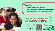Estarão abertas, no período de 26 a 30 de junho, de forma presencial, as inscrições para preenchimento de vagas do curso noturno de Técnico em Comércio integrado à Educação de Jovens e Adultos.