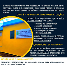 As atividades do Posto de Atendimento Pré-Processual (PAPRE) tiveram início no dia 14 de junho, com horário de funcionamento de 13h às 17h, às segundas e terças-feiras, sendo um dia para agendamento e outro dia para as sessões. A unidade vai atender aos cidadãos que residem na Comarca de Rio Pomba (municípios de Rio Pomba, Silveirânia e Tabuleiro) e que comprovem hipossuficiência nas áreas de atuação oferecidas.
