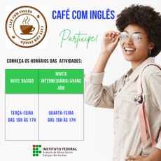 Abertas até a próxima quarta-feira, dia 7 de junho, as inscrições para os interessados em participar do projeto Café com Inglês. O projeto será realizado nas dependências do Prédio Central do Campus Rio Pomba. Os encontros de nível básico serão realizados toda terça-feira, das 16h às 17h, e do intermediário/avançado ocorrerão toda quarta-feira, no mesmo horário.
