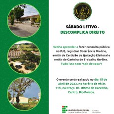 O campus Rio Pomba leva atividades do Direito para a praça central do município neste sábado, 15 de abril! O nome do evento é Descomplica-Direito e está marcado para o horário de 8h às 11h.