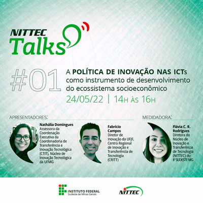 O Núcleo de Inovação e Transferência de Tecnologia (Nittec) do IF Sudeste MG vai promover amanhã, 24 de maio, das 14 às 16 horas, a primeira edição do "NITTEC Talks", que a cada dois meses vai realizar uma live com temas específicos da área, que são: inovação, propriedade intelectual, transferência de tecnologia, empreendedorismo inovador.