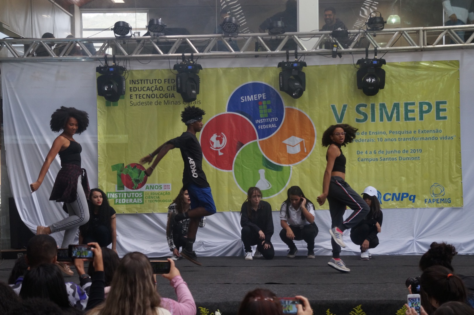 O projeto "Danças Urbanas", do professor Luciano Gonçalves, de Santos Dumont, ofereceu ao Simpósio de Ensino, Pesquisa e Extensão uma empolgante apresentação no início da tarde desta quarta-feira. Estudantes do campus local do IF Sudeste MG e participantes externos interpretaram diversas músicas de hip-hop e outros estilos e receberam não apenas os aplausos, mas também a adesão do público às danças no Auditório Principal do Simepe.
