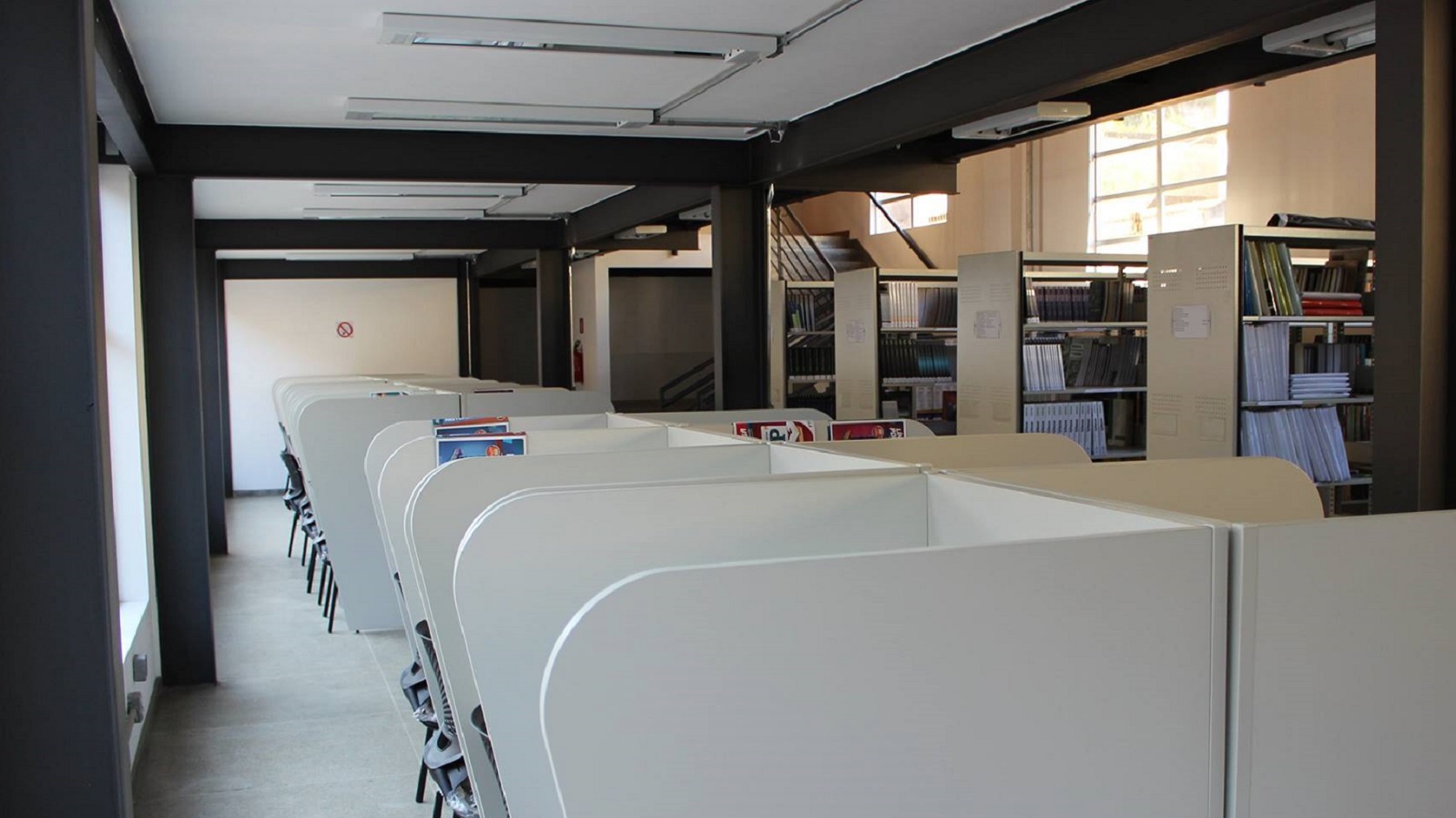 #pratodosverem: Imagem mostra espaço interno da Biblioteca do Campus Santos Dumont, com cabines de estudo e livros nas estantes.