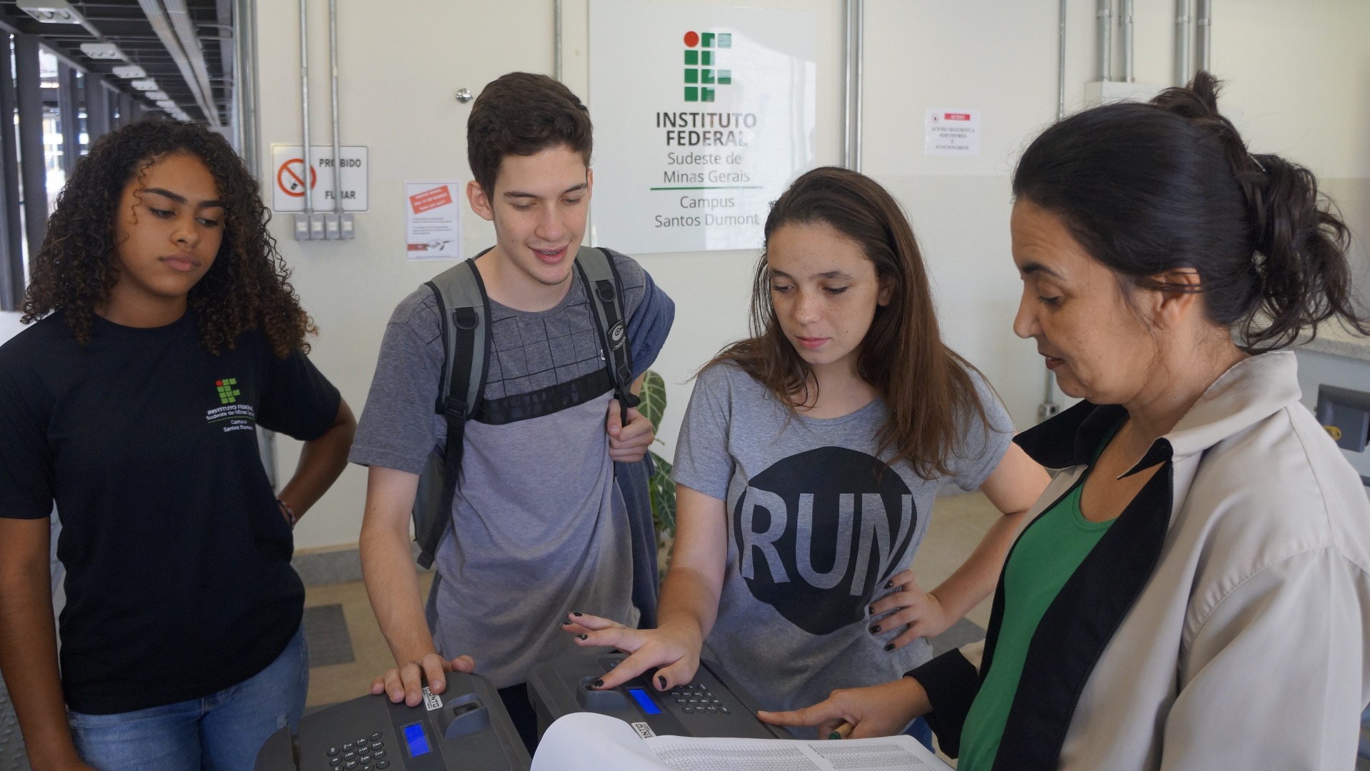 #pratodosverem: Imagem mostra três alunos e uma servidora do Campus Santos Dumont. A estudante Mirela Reis, atendida pela pedagoga Elisângela Moraes, faz o cadastro biométrico
