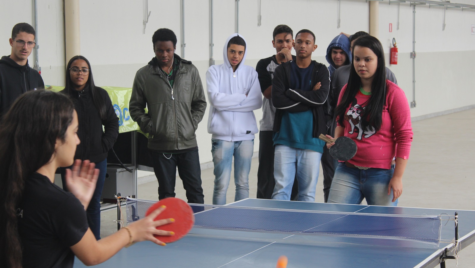 Wanessa e Lisandra jogam tênis de mesa; estudantes assistem à partida