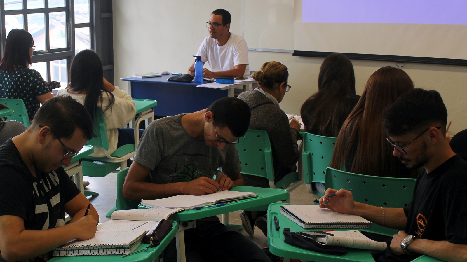 #pratodosverem: Imagem mostra estudantes realizando trabalho em grupo, na disciplina Geometria Analítica e Processos Lineares, sob supervisão do professor Gabriel Conceição