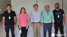 #pratodosverem: Imagem mostra diretor administrativo do HMSD, Marcelo Feliciano Costa, diretora de Extensão, Pesquisa, Pós-Graduação e Inovação do Campus Santos Dumont, professora Lívia M. Ávila, diretor-geral do Campus Santos Dumont, Benedito Carvalho, provedor do HMSD, Ivan Amorim, e técnico em Patrimônio do HMSD, Victor Camilo Braz. Foto: Assessoria de Comunicação do HMSD.