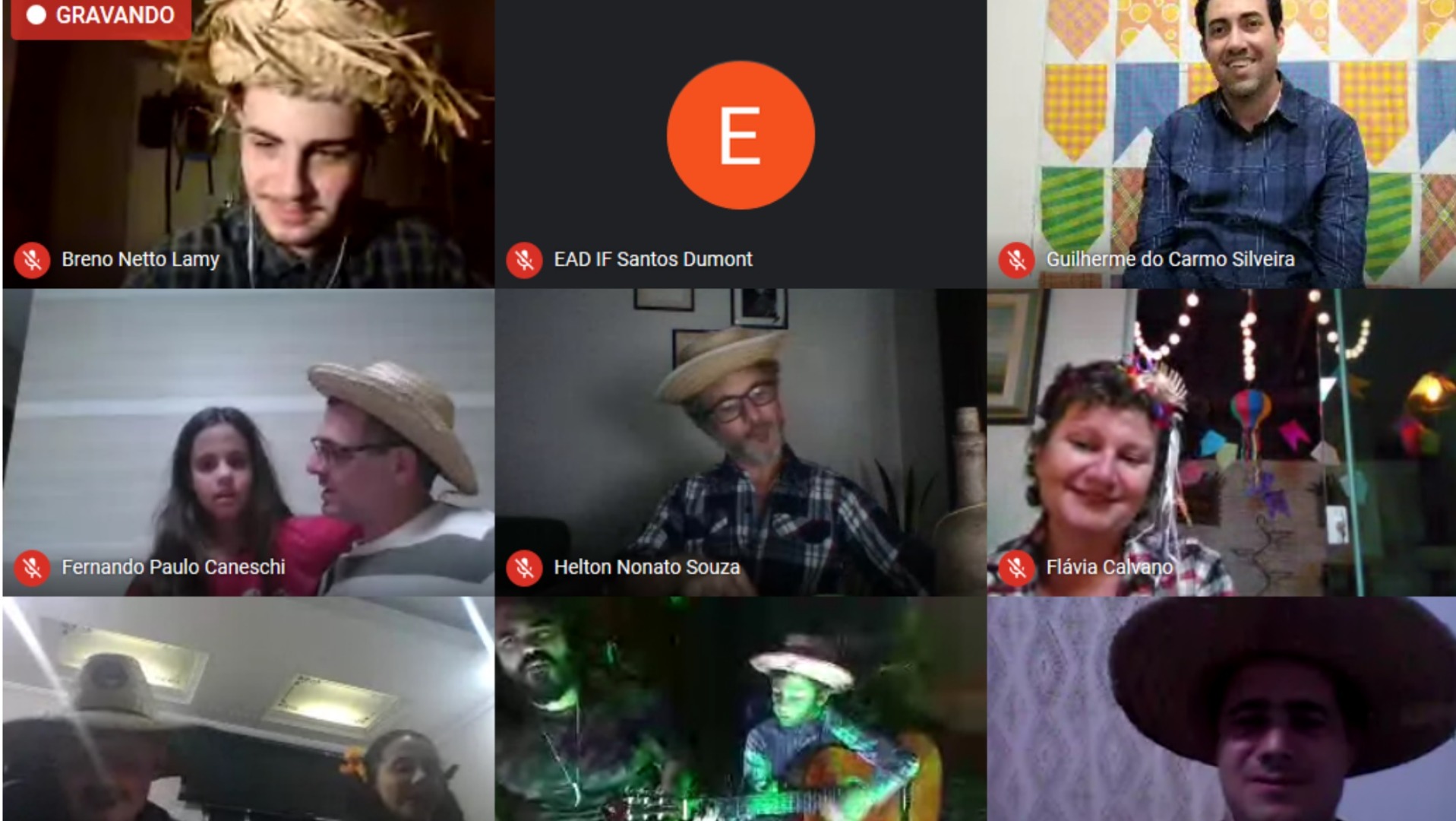 #pratodosverem: Imagem mostra servidores e alunos do Campus Santos Dumont, caracterizados, durante X Arraiá do IF em videochamada